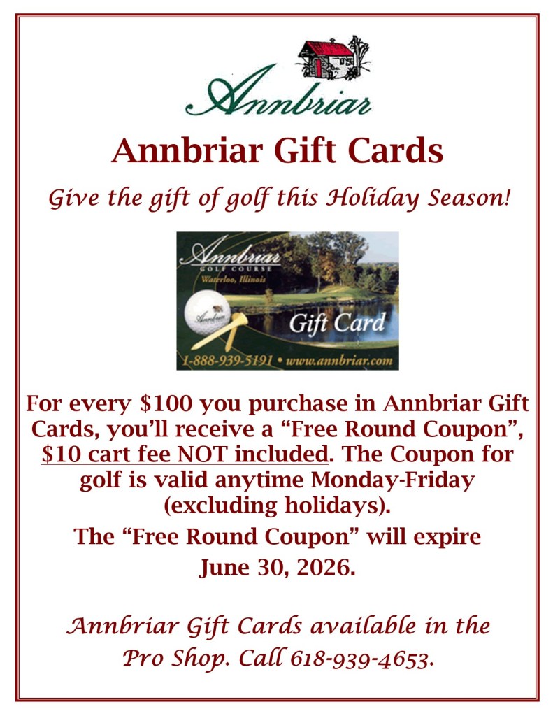 There is always a new reason to enjoy a day of golf and fun times with family and friends at Annbriar Golf Course. Golf is the ideal way to enjoy the outdoors and the company of others. Reserve your next tee time with Annbriar by contacting the Pro Shop: (618) 939-4653 or by clicking on our “TEE TIMES” tab to reserve your tee time online!